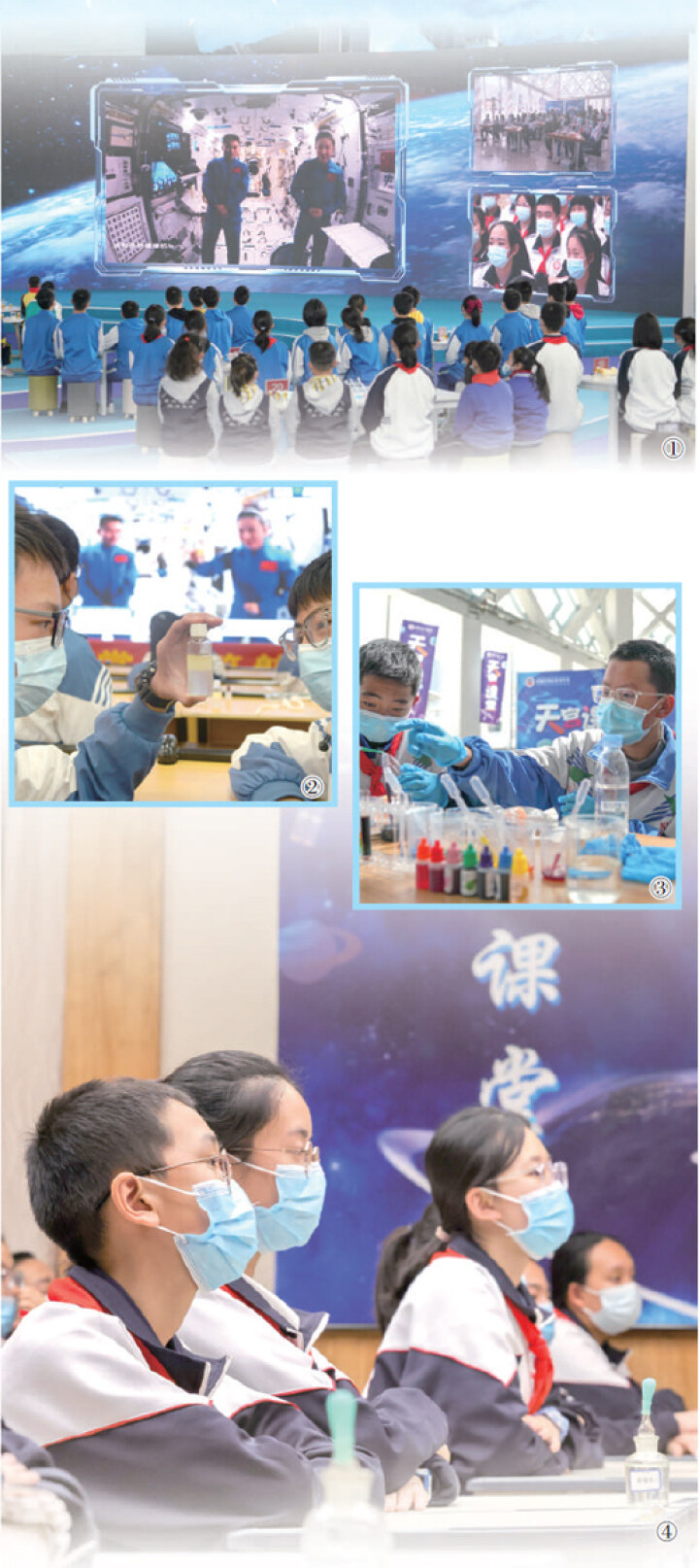 图①:“天宫课堂”第二课开讲,地面主课堂中国科技馆内的学生在听讲。新华社记者 郭中正摄