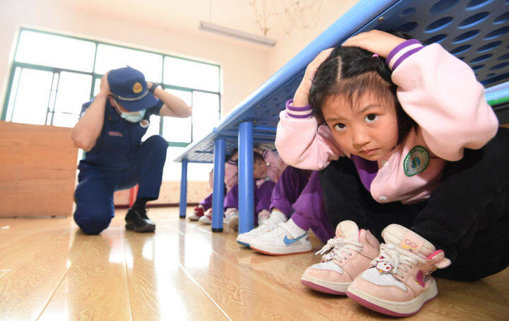 2022年5月11日,贵阳市南明区绿苑阳光幼儿园的小朋友在消防员的指导下学习防灾减灾自救技能。 新华社发(赵松 摄)