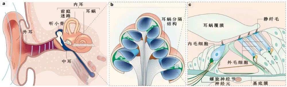 耳朵由外耳、中耳和内耳三部分组成,其中内耳包含负责听觉的关键结构——耳蜗。耳蜗是将声波转化为神经信号的核心器官,其内部盘绕着螺旋器,螺旋器中分布着承担听觉功能的感受细胞——毛细胞。