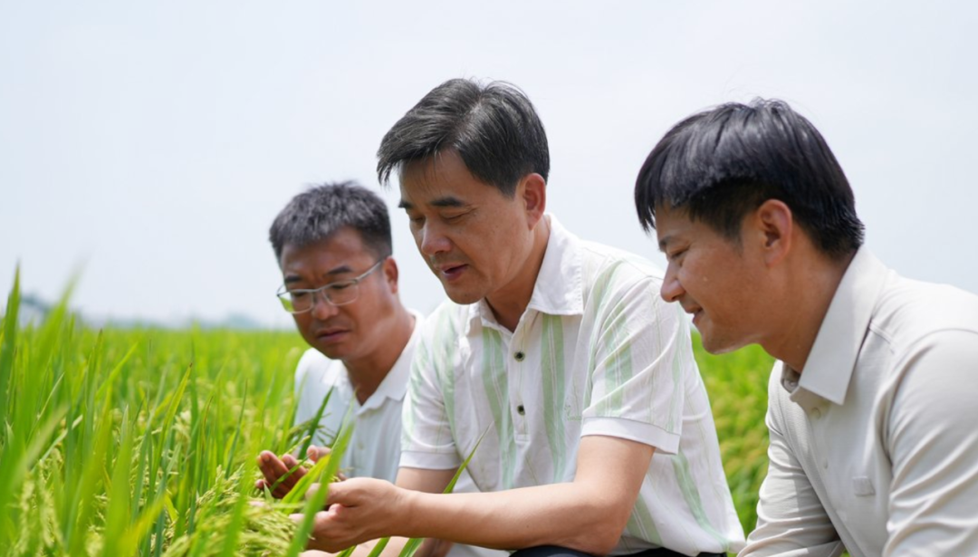 柏连阳(中)带领团队在田间观察水稻长势。