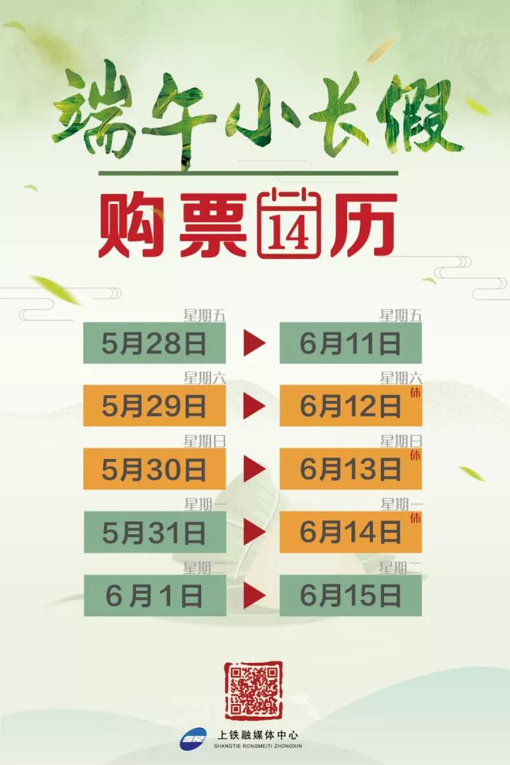 今年端午小长假放假三天,为6月12日至6月14日。如果你打算在假期出游,那可要抓紧准备买好火车票了。为配合各地落实常态化疫情防控举措,全国铁路车票预售期进行了调整,网络、电话购票时间由过去最长的30天,缩短为15天。[详情]