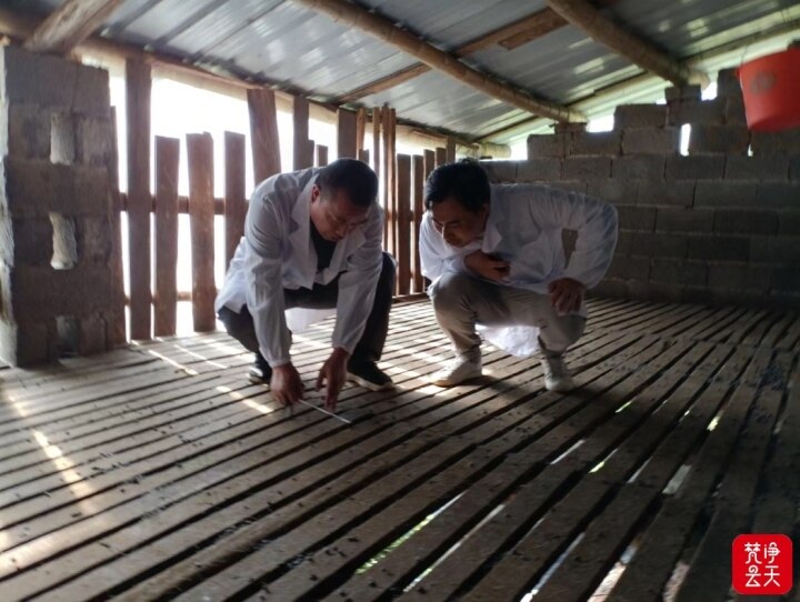 在残疾人陈泽勇的养羊场,专家们钻羊圈,拿着工具尺,对圈舍高度、地面木条宽窄空隙距离的标准,查缺点找不足,提出修改方法,使之达到规范和标准。