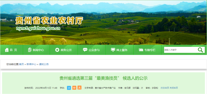 公示时间为5个工作日(即:2022年4月13日至4月19日),如对以上遴选有异议,请于公示期间向贵州省水产技术推广站办公室反映,联系电话:0851-85815762。