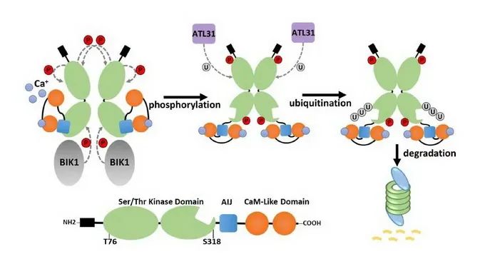 植物主要依赖自身天然免疫系统抵御病原微生物的入侵。位于植物细胞膜的模式识别受体FLS2识别到细菌鞭毛蛋白保守的肽段flg22后,与共受体激酶BAK1结合并相互磷酸化,并激活下游的胞质类受体激酶BIK1。激活的BIK1可介导活性氧(ROS)产生、钙离子进入胞质、气孔关闭等免疫反应。 [详情]