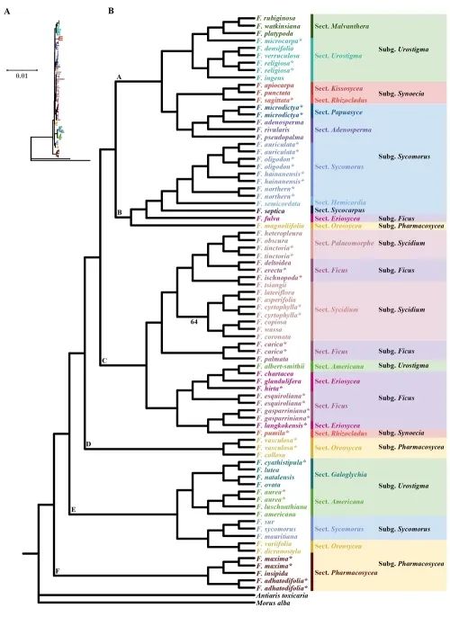 近年来,叶绿体基因组因基因组小、突变率和重组率低的特点,被广泛用于植物系统发育、分子进化、谱系地理学的研究。榕属(Ficus)作为桑科的最大属,且是热带雨林的关键物种,而其系统发育关系仍需进一步研究。榕属物种具有多样的生态型,体现了对不同生境的高度适应性。尽管近年来关于榕属叶绿体基因组的研究有所发展,但缺少基于较大样本量的全属水平的叶绿体基因组的结构变异及系统进化的分析。 [详情]
